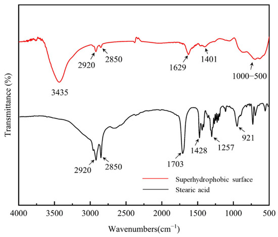 Since the stearic acid self-assembly layer is relatively thin, the FTIR investigation was performed by scraping the surface substance and then recording the spectra using KBr pellet. Figure 9 shows the FTIR spectra of the superhydrophobic Al sample and stearic acid. The two spectra lines both showed two peaks at 2920 and 2850 cm−1, representing the methyl stretching vibration peaks [11,27,51]. The two peaks indicate that the −CH2− groups in stearic acid have been assembled on the superhydrophobic surfaces. The wide peak around 3435 cm−1 is assigned to the absorption of Al–OH stretching vibration [28]. In stearic acid spectra, the peaks at 1703 cm−1 and 921 cm−1 could be considered dimer carboxylic acid and saturated carboxylic acid, respectively. Additionally, the carboxylic acid from stearic acid has absorption peaks around 1428 cm−1 and 1257 cm−1, which are the result of the coupling of the O-H in-plane bending vibration and the dimer C-O stretching vibration. While in the spectra of superhydrophobic sample, the absorption peaks of carboxylic acid disappear. Instead, the absorption peaks of the carboxylate at 1629 cm−1 and 1401 cm−1 appear, indicating some kind of reaction occurred with the Al alloy surface and the stearic acid.