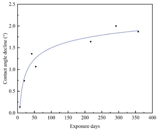 If the service life of ASHP is ten years (3650 days), the contact angle decline will be around 2.4°. The contact angle of the surface will be approximately 164.2°, which still represents excellent super-hydrophobicity.