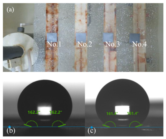 (a) Samples in the NSS test box; (b) WCA of sample No.4 before corrosion; (c) WCA of sample No.4 after corrosion.