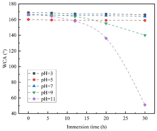 Five Al fins were used for the pH stability test. The parameters of each sample and the pH values of different immersion solutions are shown in Table 5. The contact angles were measured after immersing the five samples for 6, 12, 20, and 30 h. The variation in the contact angle with immersion time in different pH solutions is shown in Figure 12.