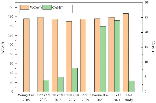 Comparing the fabricated Al fins with the existing studies, a prominent innovation is the improvement of surface wettability, that is, the improvement of the contact angle and the reduction in the sliding angle. Figure 14 shows the comparison of wettability results of different Al-based superhydrophobic surfaces. The unshown columns of CAH are due to the literature data missing. The method reported in this study enables the superhydrophobic Al surface WCA to reach above 160° stably. In addition, the upper limits of the preparation methods in literatures were not discussed. While in this study, the basis of the fabrication parameters was clearly demonstrated, and the process was optimized. In terms of surface corrosion resistance, most studies explained the anti-corrosion mechanism of superhydrophobic surfaces through electrochemical experiments but did not give the maintaining time of superhydrophobic properties. According to the application conditions and characteristics of superhydrophobic heat exchangers, this research provided a durability evaluation combined with engineering applications.