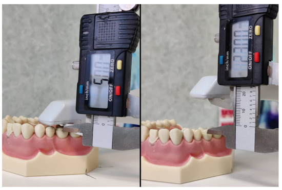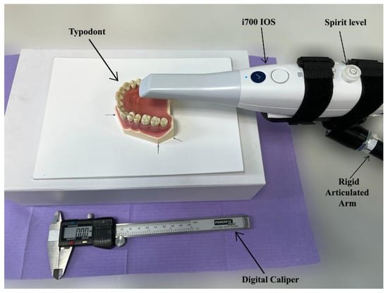 Twenty consecutive scans were performed at five predetermined distances: 5 mm, 10 mm, 15 mm, 20 mm and 23 mm by a single operator. The IOS used in this study was i700. i700 (Medit, Seoul, Korea) is the latest intraoral scanner from Medit, improving most of the features presented by Medit i500 (Medit, Seoul, Korea). The principle of 3D in Motion Video Technology/3D Full Color Streaming Capture is used for data acquisition and can export the files in open formats (OBJ, PLY and STL) [19]. To maintain the desired distance between the scanner’s tip and the overlay preparation, the IOS was attached to a rigid articulated arm. Before each scan, the distance was measured with a digital caliper (Figure 2). Calibration was performed according to the manufacturer’s instructions. The parallelism of the scanner to the occlusal plane was adjusted after each scan.