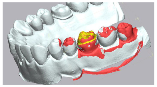 Alignment of the IOS mesh over the reference mesh. The isolated area of interest is displayed in yellow color.