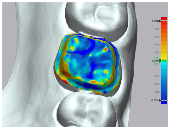 The trueness data was obtained by executing the “initial alignment” function to superimpose the intraoral scanner mesh over the reference mesh followed by the “best fit alignment” (Figure 3). In order to analyze the deviation between the reference and measured data, the “3D Compare” function was used by projecting all paired points onto the reference data. A color-coded map was rendered displaying the deviation patterns of the investigated surfaces. The color-coded map was set to display deviations between ±50 μm (Figure 4). In order to obtain the precision values, each intraoral scanner mesh was compared with all the other meshes within its group following the same exact same steps.