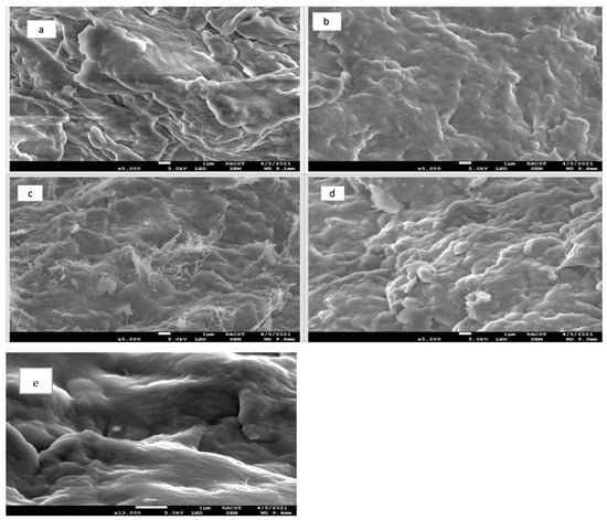 The surface morphology was obtained using a scanning electron microscope (SEM). The morphology of the pure paraffin sample is shown in Figure 2a, and the paraffin composition sample with the nanotubes is displayed in Figure 2b. Finally, the composites we prepared in this study after adding TiO2 by various concentrations, is displayed in Figure 2c–e (details of SEM images of MWCNT shown in the supplementary materials Figure S1).