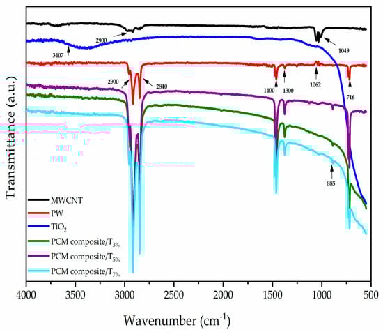 The chemical compositions of the composites were determined by Fourier transform infrared spectroscopy (FTIR) analysis. Figure 3 demonstrates that most of the absorption ranges of PCM composites were in the range of 2900–2800, and two absorption peaks were shown at 2900–2840 cm−1; they correspond to the expansion oscillations between CH2. This means that there is an alkene group. Additionally, there is a wide absorption range between 1400 and 1300 cm−1 that can be attributed to CH2.