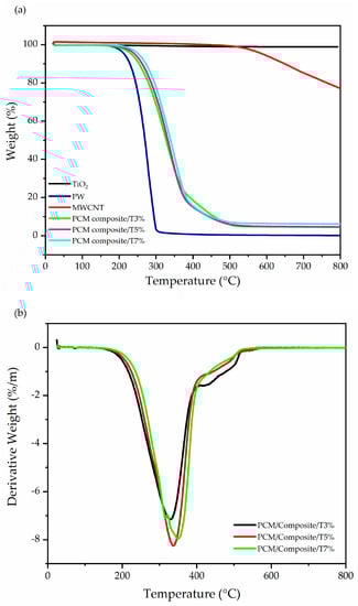 (a) Thermogravimetric analyzer (TGA) plot of the composites (b) derivative thermogravimetry curves of PCM composites.