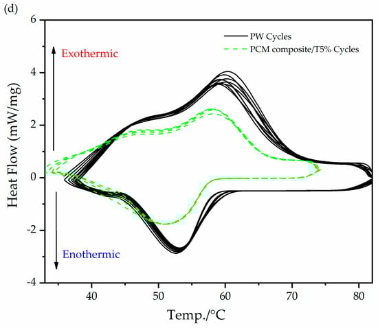 We also provide a measure of the workability of the long-term use of the thermal energy system, presented in Figure 5d, for a concentration of 5 wt.%. The curves, after the first cycle, were synchronized with the fifteenth cycle, which we noticed was similar behavior to the PW, with only a slight change of less than 15 °C. This means that adding nanoparticles to PW at a concentration of 5 wt.% gives excellent results for the enhancement of thermal conductivity and high reliability after cycles.