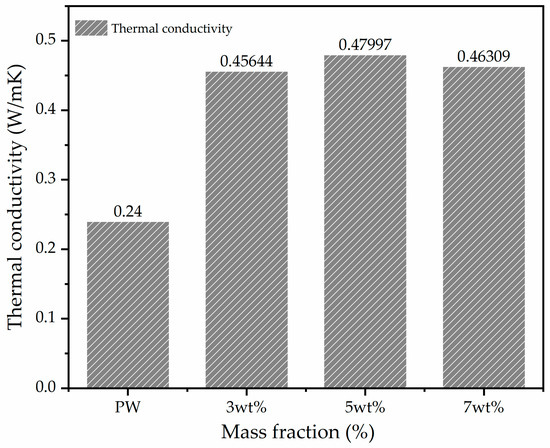 Therefore, the thermal conductivity and effusively were measured at room temperature, 25 °C. As is well-known, PW has poor heat conductivity and photon transport suppression because of its lower density, which could delay the heat response to the thermal storage or release [13,22]. Thus, developing composites based on MWCNT and transition metal TiO2 which have thermal conductivity is important to enhance the performance of PW. Figure 6 shows the thermal conductivity of the PCM composites prepared with different concentrations of MWCNTs/TiO2 compared with PW. The thermal conductivity of the pure PW is 0.24 W/m, and that of the composites is 0.45, 0.47, and 0.45 W/m for concentrations of 3, 5 and 7 wt.%, respectively. We observed that the thermal conductivity of the PCM composites increases while increasing the mass fraction compared to pure PW. However, at 7 wt.%, it did not increase, maybe due to a clot of carbon nanoparticles, because the agglomeration of nanoparticles minimizes the thermal properties in the composite, and the enthalpy decreases, as shown in Figure 5. Therefore, the main challenge in this project is enhancing the thermal conductivity by preserving the high latent heat of the PCM composites. The results show that the 5 wt.% dose is the most appropriate for this purpose in this study.