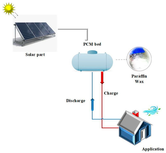 A thermal energy storage system consists of a cylindrical tank filled with PW connected to the solar part. An electrical heater is used to supply heat to the thermocouples, and they are located in the direction of the cylindrical tank to record the temperature of the PCM [13]. The system is controlled using a proportional integral derivative (PID) controller in order to take advantage of stored energy, which can be used at a later time for domestic or industrial applications, as seen in Figure 7.