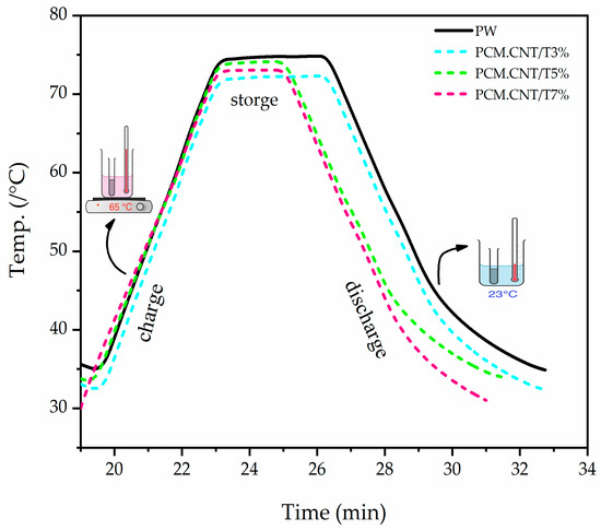 The experimental results illustrate the transition phases driving energy storage in pure PW and the composite 3 wt.% beginning at 15 and 12 min, respectively. We note that the storage period is similar to the storage period of PW because the loading of nanocomposites is low. Meanwhile, the period given for the PCM composites 3 and 7 wt.% are 10 and 9 min, respectively, and the storage efficiency of the pure PW and composites is 87% 91%, 97%, and 95%, respectively. This time decrease in the thermal storage corresponds to the increase in the heat transfer due to the enhancement of the thermal properties due to the addition of CNT/TiO2.