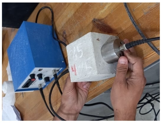 The test is described in ASTM C 597–09 [42], the direct measurement procedure of the UPV test is based on measuring the time of longitudinal stress wave pluses through concrete between two transducers attached to the concrete on the opposite surface of the concrete specimen (Figure 3). Once the distance between the two transducers is measured and the time of transmitting stress waves from one transducer to the second one is obtained the pulse velocity is simply calculated by the following formula: