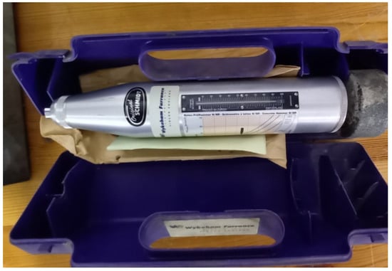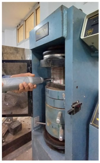 The hammer rebound test is described in ASTM C: 805 [47]. The test is performed by the main Schmidt hammer apparatus (Type N) as shown in (Figure 4). The depth of the tested area shall be at least 100 mm and 150 mm in diameter. The rebound hammer test is based on the principle that the rebound of an elastic mass depends on the hardness of the surface against the mass impinges. First, two opposite faces of the specimen were prepared with abrasive stone to ensure the ground and smooth surface of the specimen, then the measuring points were prepared and located. Later, each specimen was rigidly supported by applying a slight load using a compression testing machine (Figure 5). The hammer should be firmly held in a perpendicular direction to the prepared test surface. At least ten readings were obtained on each face of the specimen. The rebound hammer was kept horizontal in all measurements. The readings were evaluated and recorded.