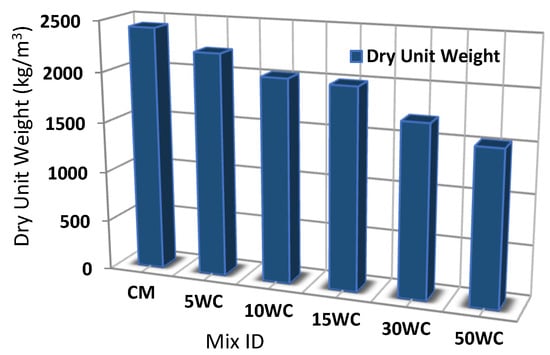 The dry unit weight was reduced by adding wood shavings, and up to 36% reduction was recorded at a 50% level of replacement. The reduction of the dry unit weight of woodcrete is due to the reduction of the weight of conventional aggregate that is replaced with lighter material (wood shavings) and the increase in air voids as the amount of wood shaving was increased.