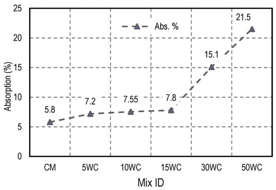 Water absorption of different mixes was measured based on ASTM C642-13. Water absorption is simply calculated by measuring the increase in mass as a percentage of dry mass the results were presented in (Figure 7). It was observed that the water absorption increased as the amount of wood shavings increased. Water absorption of concrete mixes 5WC, 10WC, 15WC, 30WC, and 50WC increased by 24.1%, 30.2%, 34.5%, 160.3%, and 270.7%, respectively, compared to the control mix. The water absorption of mixes containing up to 15% of wood shavings was less than 10%, which is considered a good quality concrete [48,49]. However, the water absorption sharply increased in woodcrete containing 30% or more of wood shavings. This is obviously due to the nature of wood, which is the ability to absorb water, and for higher wood shavings inclusion the increase can be attributed to the existence of some wood shavings on the surface of the samples which directly contacted water.