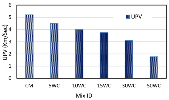 As the amount of wood shavings increases, the UPV decreases, and the UPV of woodcrete ranges from 1.77–4.49 km/s. The control mix recorded 5.2 km/s and the highest value of UPV was recorded for 5WC, which was 13.7% lower than the control mix. The lowest value of UPV was recorded for the 50WC mix and it was 66% less than CM. Figure 8 represents the UPV values. The reduction in UPV can be attributed to a decrease in solid particles and an increase in air voids as the amount of wood shavings increased, similar conclusions were derived by [43].