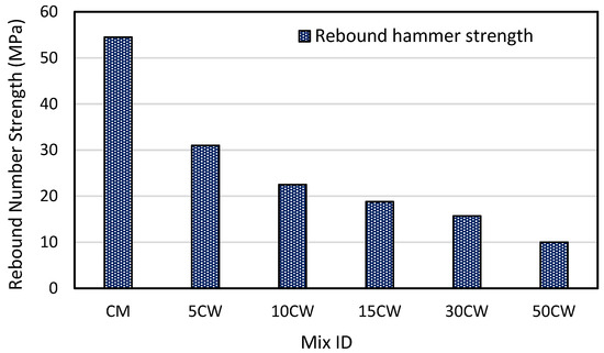 After conducting the rebound hammer test on all samples, the average of the rebound number is calculated and revised by discarding the readings that differ by six units from the average (ASTM C: 805) [47]. The rebound number decreased as the amount of wood shavings increased, the rebound number decreased by 30.9%, 38.4%, 47.2%, 51.4%, and 63.2% for 5WC, 10WC, 15WC, 30WC, and 50WC mixes, respectively, compared to the control mix which had an average rebound number of 49.2. Figure 9 represents the rebound number strength for different mixes. The rebound numbers used to estimate the compressive strength of the control mix and the mixes contained wood shavings and were found to be 54.5, 31, 22.5, 18.8, 15.7, and 10 MPa for CM, 5WC, 10WC, 15WC, 30WC, and 50WC, respectively. The rebound hammer test results affect the surface of concrete and the existence of voids and aggregates [48,49], and the presence of voids would yield a lower rebound number. In addition, the wood shavings particles are less stiff than normal aggregate; hence, they absorb more energy, which results in a lower rebound number that is noticeable at the higher wood shavings amount (30–50%).