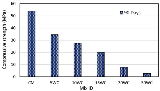 The test was conducted according to (BS EN 12390-3:2009) [50]. At the age of 90 days, the specimens were tested and the average of three specimens was recorded. Figure 10 illustrates the compressive strength of different concrete mixtures containing wood shavings at 90 days. Concrete mixes 5WC, 10WC, 15WC, 30WC, and 50WC showed lower compressive strength than the control mix, at 35.8%, 48.8%, 62.7%, 85.3%, and 94.8%, respectively, lower compressive strength compared to the control mix which has a compressive strength of 53.9 MPa. Though 5WC, 10WC, and 15WC mixes have a compressive strength of 34.6, 27.6, and 20.1 Mpa, respectively. The regression analysis of data reveals that compressive strength correlated in an exponential custom, as the amount of wood shavings increased (Equation (3)) and the coefficient of regression (R2) was found to be 0.998, the percentage difference between actual values of compressive strength and the predicted strength based on (Equation (3)) ranged from ±(3–6%).
