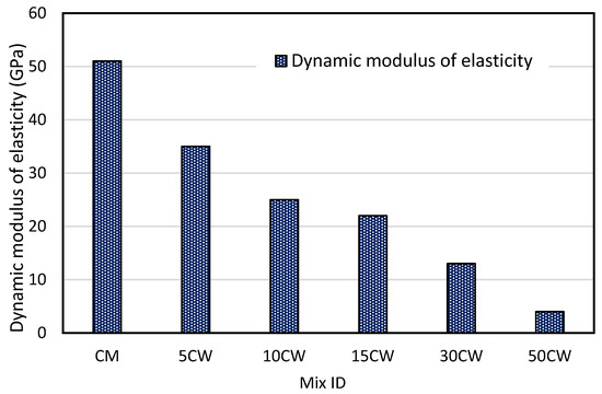 It was mentioned earlier that there is a unique relation between UPV and the dynamic modulus of elasticity which is governed by Equation (2) mentioned above. By plugging the values of pulse velocity (V) and dry unit weight (), it is assumed that the value of dynamic poisons ratio (μ) is equal to 0.28 [51,52]. Figure 11 shows the values of dynamic modulus of elasticity for different percentages of wood shavings [53,54].