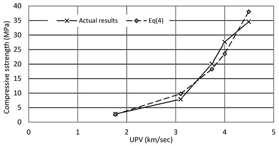 The ultrasonic pulse velocity test results were used to establish a correlation with destructive test results. The generated equation (Equation (4)) estimated the compressive strength with an error percentage up to 33.4%.