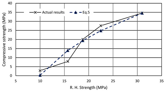 The percentage difference between actual values of compressive strength and the predicted strength based on (Equation (5)) were (3–10%) less than actual values for mixes containing 5–15% wood shavings. For mixes containing 30–50% of wood shavings, the equation yielded a higher percentage difference of approximately ±90%, Figure 13. The relation between actual compressive strength and predicted compressive strength is based on (Equation (5)).