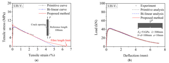 Similarly, both the primitive and bilinear softening curves suggested by Yoo et al. [33] were converted into the tensile σ-ε curve depending on a reference length of 100 mm. The comparisons of the predicted tensile σ-ε curves obtained from the proposed inverse analysis with the analysis of Yoo et al. [33] are presented in Figure 11. The maximum tensile strain 6.5% corresponding to the cracking opening of 6.5 mm in accordance with the fiber length limit is obtained from the proposed analysis method. Compared with the primitive analysis, the results derived from the bilinear analysis seem to slightly overestimate the experimental load–deflection in the descending branch, especially for UH-V2 and UH-V4. The stress–strain response obtained from the proposed method provides the best fit of the primitive softening curve for UH-V1, UH-V2, and UH-V3. A slight deviation between the proposed analysis and the primitive analysis result for UH-V4, as shown in Figure 11g, is mainly due to the intrinsic scatter of the experimental load–deflection responses at a high strength level and the low disperse degree of the fiber. The first cracking tensile strength with an approximate value of 10MPa is obtained by the proposed method for all specimens. This means that, due to effect of the fiber volume fraction, UH-V1 exhibits a strain-softening behavior while UH-V2, UH-V3, and UH-V4 exhibit a strain-hardening behavior. Therefore, the verification results indicate that the proposed method can be used for predicting the postcracking tensile behavior of UHPFRC.