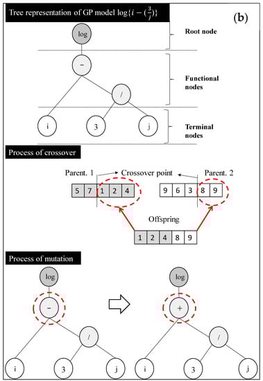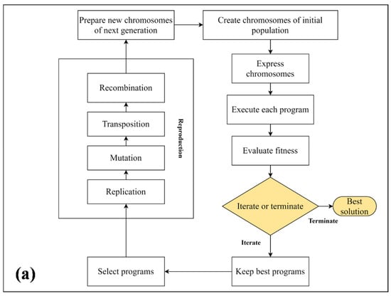 A GEP approach based on Darwin’s evolution theory and Mendel’s genetic theory is one of the most intellectually compelling computational intelligence approaches [55,56]. With GEP, there are two languages: the language of genes and the language of expression trees (ETs), and understanding the sequence or structure of one is equivalent to understanding the other [57]. A typical GEP model involves the following steps, as shown in Figure 1a.