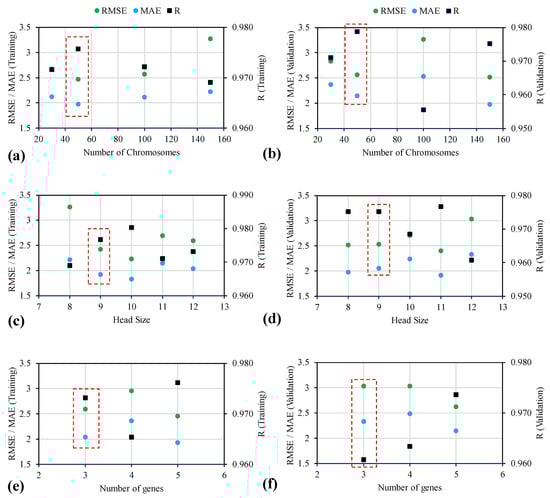 While exercising modeling using the GEP model, genetic parameters—namely, number of chromosomes, head size, and number of genes—were varied alongside the evaluation of models in the form of statistical equations for the correlation coefficient (R), mean absolute error (MAE), and root mean square error (RMSE) given as Equation (2) to Equation (4) in accordance with the previous research [65,66,67,68,69,70]. Initially, number of chromosomes were changed from 30 to 150 to select the best number of chromosomes for the next model generation. The best model for variable setting chromosomes was based on the overall MAE and R2 for the developed models. Subsequently, head size was changed between 8 and 10. Finally, number of genes was varied from 3 to 5. Further increase in the number of genes may affect the performance of the model; however, it also complexifies the mathematical equation. Figure 2 displays the effect of setting parameters on the performance of the models. Figure 2a,c,e and Figure 2b,d,f depict the performance of the models for the training data and validation data with respect to number of chromosomes, head size, and number of genes, respectively. It can be observed that increasing the number of chromosomes from 30 to 50 increased the performance in the sense of increasing R and decreasing MAE and RMSE for both the training and validation data. In contrast, an additional increase in the number of chromosomes from 50 to 100 decreased the performance of the models. The best number of chromosomes was achieved at 50; therefore, more trials on developing the best models by changing head size were exercised with 50 chromosomes.
