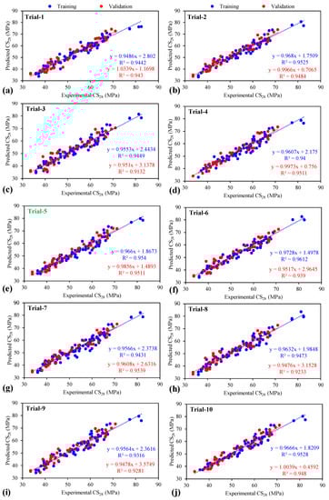 Figure 3a–j presents the comparison of the regression slopes between modeled and experimental results for all the 10 GEP trials (training and validation datasets are represented by blue and red, respectively). It can be seen in Figure 3 that the CS28 is accurately predicted for almost all the proposed models wherein the lowest–maximum regression slopes for training and testing datasets are 0.9468 (Trial 1)–0.9728 (Trial 6) and 0.947 (Trial 8)–0.9973 (Trial 4), respectively. In the previous studies, slopes ranging between 0.80 and 0.90 were considered indicators of the achievement of higher performance, when modeled with GEP approach [29,79,80]. Based on their findings, it can be stated that all of the formulated GEP trials exhibited comparatively better performance. Trial 5 was selected as the optimal trial on the basis of overall R and MAE values (in the previous section). In addition, the nearness of the points to the ideal fit (1:1 line) and the presence of the majority of the points inside the allowable confidence interval elucidates the validity of GEP models [42]. The points which are closer to the regression line depict better prediction performance of a formulated GEP model [81]. While considering the plots of regression slopes (in Figure 3), it can be observed that Trial 6 and Trial 4 possessed the maximum slopes for training and validation datasets, respectively. On the contrary, the values of slope in the case of Trial 5 were recorded as 0.957 (training) and 0.961 (validation). Upon comparing the overall MAE values of the three trials, it is found that Trial 5 has the lowest value (1.9865) in contrast to Trial 4 (2.096) and Trial 6 (2.0325). Moreover, the comparatively higher R value (0.953) in case of Trial 5 further makes it a final choice to be considered as the most optimal model. Note that, an R value exceeding 0.8 illustrates better performance of the GEP model [79,82]. Therefore, the prediction accuracy of Trial 5 is higher.