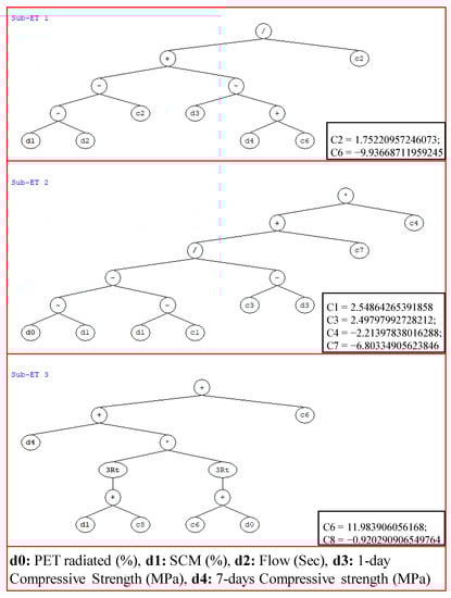 The expression trees shown in Figure 5 and the MATLAB code obtained from the GEP model were used to extract mathematical equation (Equation (6)) to predict the compressive strength of PET containing SCM based grout in accordance with the previous literature [84]. The prediction equations were obtained for the best model, Trial 5, in this study. The complexity of the mathematical equation depends upon the number of sub-ETs which depends on the number of genes. It is evident that Trial 5 contains three genes in its setting parameters; hence, four sub-ETs can be observed in Figure 5. Furthermore, Figure 5 shows linking functions (+, −, /, ×, cubic root), constants (C1 to C8), and variables in the form of d0 to d4 denoting PET percentage, percentage of SCM, flow, 1-day compressive strength, and 7-day compressive strength of cementitious grout, respectively, used in the formulation of GEP mathematical model.