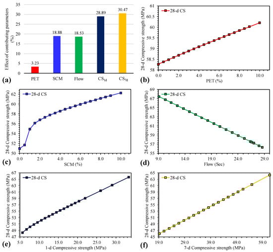 Firstly, the results of sensitivity analysis in Figure 6a shows a rising trend of input parameter contributions to determine the CS28d of waste PET/SCM blended cementitious as CS7d (30.47%) > CS1d (28.89%) > SCM (18.88%) > Flow (18.53%) > PET (3.23%). Therefore, CS7d is most substantial factor that influences the long term CS28d of cementitious grout mixes, followed by CS1d, flow, and proportion of the SCMs.