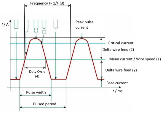 12]. Double pulse welding requires precise regulation of the frequency, intermittency, and wire feed speed parameters. Changing these parameters can induce changes in the process characteristics. In particular, the specific wire feed rate can influence the droplet size. By proper adjustment of the frequency parameter, it can be ensured that one droplet is transferred per pulse, and the intermittency affects the final appearance of the welded joint [