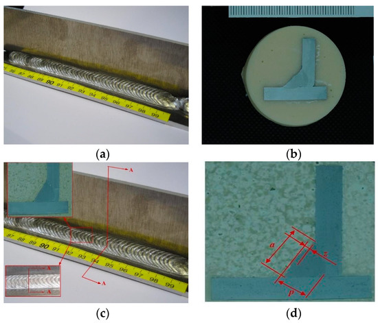 Figure 2c. The image obtained by the cross section of the weld was the same for each thin section. Based on the distance measurements on the thin sections, the values of the output variables were obtained, i.e., the values for the insufficient/excessive thickness of the fillet, the penetration, and the weld width, as shown in