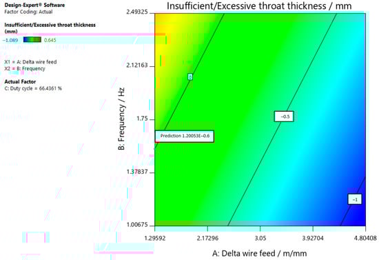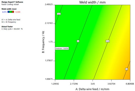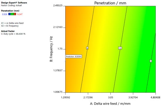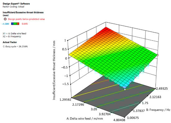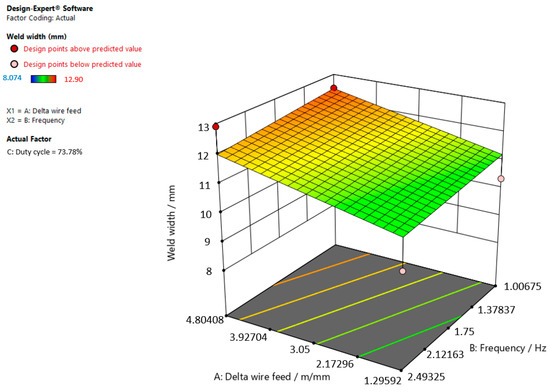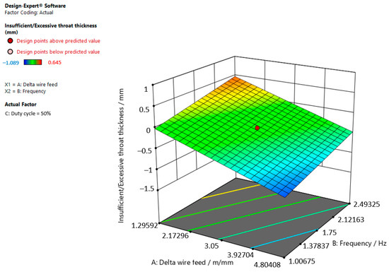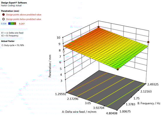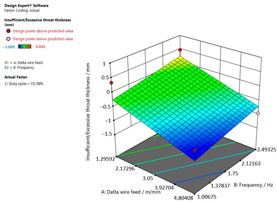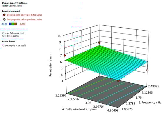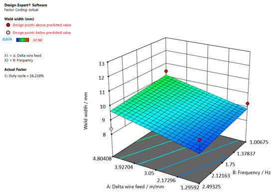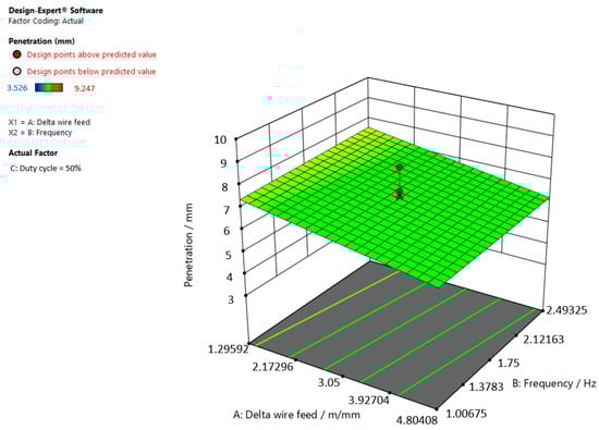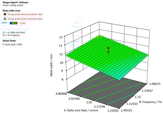 Table 5. The values of the delta wire feed on the machine vary by ± 0.1 m/min, so exact values could not be obtained. For example, the reading was 1.29592 m/min, but values of 1.3 m/min, 3.1 m/min, and 4.8 m/min were selected; and the frequency parameter varies by ± 0.1 Hz, so values of 2.5 Hz, 1.00 Hz, and 1.8 Hz were selected. Also, the duty cycle parameter can be selected in the range of ±1%, and the selected parameters were 26% and 74%.
