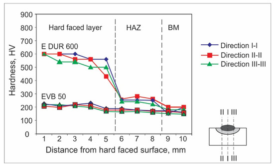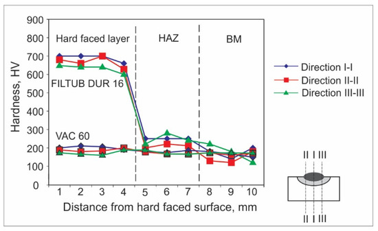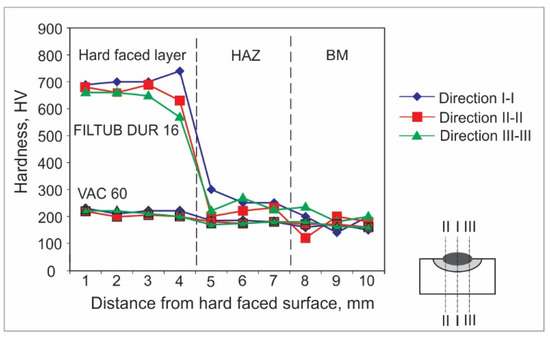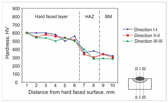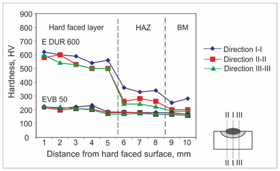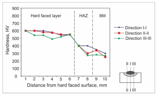 Hardness measurements can be achieved by various experimental methods. For welded joints and hard-faced layers, hardness is usually measured by the Vickers method due to a number of advantages; the main one is that this method has no restrictions on the value of the measured hardness. For the purpose of this research, the hardness measurements were performed in an accredited laboratory, using the Vickers method (pressing force F ≈ 100 N), and according to the appropriate standard. The obtained results are presented in the form of diagrams of hardness distribution along the hard-faced layer’s height in Figure 1, Figure 2, Figure 3, Figure 4, Figure 5 and Figure 6. The hardness of the weld’s characteristic zones is usually measured in three mutually parallel directions, marked as I-I, II-II, and III-III, passing through all the zones.