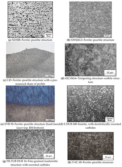 The main structure present in the base metal was ferrite–pearlite, as shown in Figure 8a–c. In the case of the structural steels (Figure 8a,b), the presence of pearlite is somewhat smaller (due to lower carbon content in the steel), while for the steel for tempering C45 (Figure 8c), the presence of pearlite is more prominent. The 42CrMo4 steel (Figure 8d) is characterized by the tempering structure (sorbite).