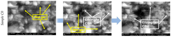 Each sample was monitored for a period of 3 to 6 h (depending on the specificity of the observed morphological changes) and the images were acquired every 10 min at magnifications of ×5000 and ×10,000. The morphologies for the sample with 100% cement (sample C0—reference) and the sample with 85% cement and 15% ash (sample C15) are shown in Figure 3. The legends show the time of acquisition, with the first image taken immediately after the “dead” time limit, called t0. In the micrographs of hydrated cement paste, we could observe the evolution of the first hydration products cement, with the formation of acicular structures of ettringite and CSH/CASH (calcium/aluminium silicate hydrates) [37,38]. Smaller particles are more reactive compared to larger ones. The hydration products tended to crystallize into cracks and pore spaces. A significant amount of cement hydration reactions appeared to have occurred during the “dead” period. The soft and fragile bride’s veil morphology of CSH appeared to have emerged from all surfaces.