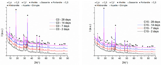 On the other hand, the same analysis performed on the C15 sample revealed: (i) a decrease in C3S content from 22.2% after 2 days to 5.8% after 28 days; (ii) an increase in afwillite and hillebrandite content from 17.7% after 2 days to 33.4% after 28 days; (iii) a decrease in portlandite content from 18.8% after 2 days to 17.3% after 28 days and (iv) an increase in ettringite content from 11% after 2 days to 12.7% after 28 days. In this case, the degree of crystallinity had a decreasing tendency over time up until 28 days of hydration in the blended cement pastes.