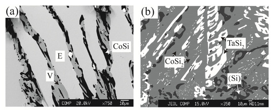 Zone 1 mainly contains the phase equilibria at the Si-rich corner (Si > 50 at.%). For the Co34Ta26Si40 alloy that was annealed at 1100 °C, a distinct three-phase equilibrium of E + V + CoSi was observed in Figure 2a and their crystal structures could be confirmed by the corresponding XRD pattern in Figure 3a. As shown in Figure 2b, the Co26Ta7Si67 alloy is located in a three-phase equilibria region after being annealed at 1100 °C. The white and light gray phases correspond to the TaSi2 and CoSi2 phases, respectively, while the dark gray phase is presumed to be the solid solution phase of Si (signed as (Si)). The corresponding XRD pattern indexing result in Figure 3b further confirmed this speculation.