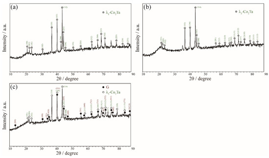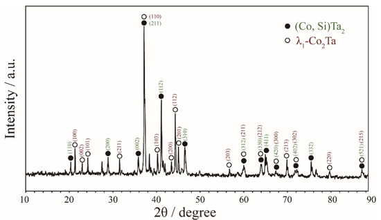 Zone 2 corresponds to the phase equilibria at the Ta-rich corner (Ta > 50 at.%). In Figure 4a, a two-phase equilibrium of (Co, Si)Ta2 (white) + λ1-Co2Ta (black) was confirmed in the Co30Ta43Si27 alloy quenching from 1100 °C based on the support of the corresponding X-ray diffraction pattern in Figure 5. As shown in Figure 4b, the Co11Ta75Si14 alloy formed a two-phase equilibrium microstructure of (Ta) + (Co, Si)Ta2 after being annealed at 900 °C. Figure 4c depicts the three-phase equilibrium of (Co, Si)Ta2 (white) + Co6Ta7 (grey) + λ1-Co2Ta (black) in Co41Ta47Si12 alloy after being annealed at 900 °C.