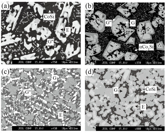 Zone 3 mainly discusses the phase equilibria around G″ phase. The alloy Co46Ta13Si41, Co58Ta10Si32 and Co48Ta22Si30 were designed to explore the existence of the G″ phase. For Co46Ta13Si41 and Co58Ta10Si32 alloys that being annealed at 1100 °C, two three-phase equilibrium CoSi + E + G″ and αCo2Si + G + G″ were detected as shown in Figure 6a,b. The corresponding XRD patterns in Figure 7a,b indicate that the diffraction peaks belonging to the phases (CoSi, E, αCo2Si and G) are in good agreement with the standard patterns. However, the diffraction peak of the G″ phase was not interpreted due to the lack of crystallographic information. For the Co48Ta22Si30 alloy annealed at 1100 °C, a clearly three-phase equilibria E (white) + G (light gray) + G″ (dark gray) was detected, as shown in Figure 6c. However, the EMPA micrographs and WDS analysis of the same alloy (see Figure 6d) quenching from 900 °C show that it is a three-phase of E + G + CoSi. This result implies that the G″ phase is a high-temperature compound, which is not stable at 900 °C.