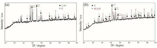 XRD patterns obtained of (a) Co46Ta13Si41 alloy annealed at 1100 °C for 60 days and (b) Co58Ta10Si32 alloy annealed at 1100 °C for 60 days.