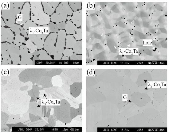 The alloy with a nominal composition of Co59Ta31Si10 was designed to detect the L phase as shown in Figure 8b. The interpretation of the corresponding XRD pattern in Figure 9a indicates that this ternary L phase crystalizes the same as the Zn2Mg-type compounds (P63/mmc, C14) like the binary λ1-Co2Ta phase. Additionally, the λ1-Co2Ta phase is a high-temperature phase that only exists above 1294 °C [27]. However, the detected ternary L phase is stable at 900 °C and 1100 °C, suggesting that the addition of Si stabilizes the λ1-Co2Ta phase toward low temperature. Besides, this Co-Ta-Si ternary L phase shows an extremely similar compositional range compared with the Ni-Nb-Si system [43]. The alloy Co65Ta27Si8 was designed to determine the phase equilibria of the G and three Laves phases (λ1-Co2Ta, λ2-Co2Ta and λ3-Co2Ta). A single λ3-Co2Ta phase was detected in Co65Ta27Si8 alloy annealed at 1100 °C (Figure 8c), while the λ3-Co2Ta + G was observed for the same alloy being annealed at 900 °C (Figure 8d). The corresponding XRD patterns in Figure 9b,c confirm the above equilibrium relationship.