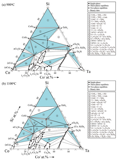 Based on the phase equilibrium information discussed in Section 3.1, the isothermal sections of the Co-Ta-Si ternary system at 900 °C and 1100 °C are constructed in the whole composition range (see Figure 10). Nineteen and twenty-one three-phase regions were observed at 900 °C and 1100 °C, respectively. Few undetected three-phase regions are indicated by the dashed line.