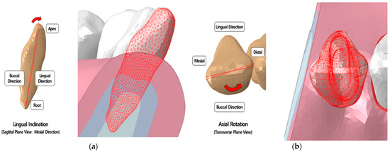We used the same malocclusion tooth-alveolar bone model that we used in our previous study [21]. The central incisor (#31) position was modified in the present model. The central incisor had an inclination of 1.5° in the lingual direction with respect to the center of resistance of the tooth in the sagittal plane, and an axial rotation of 5° from the distal to the mesial direction with respect to the tooth axis in the transverse plane [21]. These parameters were chosen to create malocclusion models that required correction of inclination and axial rotation of the central incisor (Figure 4). The maximum tooth deformation value suggested by the National Health Service (UK) and Align Technology was used [23,24]. The treatment plan, devised by an orthodontist, was to move the deformed central incisor to its normal position. All crowding tooth deformations were simulated using 3D model-based orthodontic treatment planning software (DICAON-4D, DENTIS Co., Ltd., Daegu, Korea). The material properties of the malocclusion models were the same as those of the normal model. Six models were created: malocclusion models of inclination and axial rotation for 0.5- and 0.75-mm-thick transparent aligners and for a fixed appliance (Figure 5).