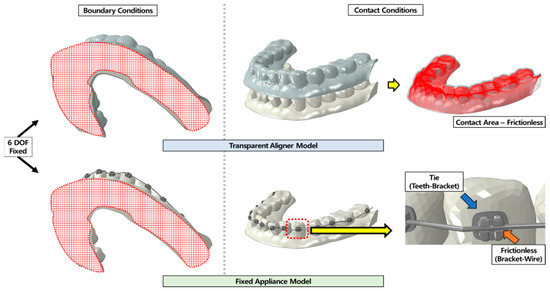 Boundary and contact conditions of loading condition verification analysis. The entire lower surface (red area) of both the fixed appliance and the transparent aligner models were constrained to 6 degrees of freedom to set the boundary conditions. The contact condition was frictionless between the transparent aligner and teeth. In the fixed appliance model, a tie condition was applied for the teeth and bracket, while the bracket and arch-wire contact were considered to be frictionless.