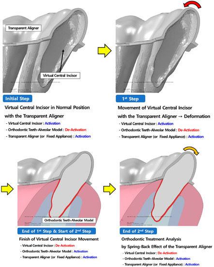 The second stage was then analysed. The spring-back property of the arch-wire of the transparent aligners and the fixed appliance, which allows it to return to its original shape, is used to perform orthodontic treatment without additional loading conditions. The second stage was analysed once the orthodontic appliance was fixed, and the analysis was completed when the orthodontic appliance could not return to its original shape and orthodontic treatment ended (Figure 9) [20]. These Model Activation/De-Activation loading conditions were also applied to the orthodontic treatment analysis.