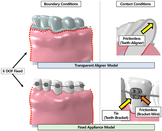 Boundary and contact conditions in orthodontic treatment analysis. On both sides (red dashed line) of the tooth-alveolar bone model with a transparent aligner and fixed appliance constrained to six degrees of freedom. In the transparent aligner model, the bottom surface was set so that there was no movement. The contact condition was frictionless between the teeth and aligner, as in the verification analysis. In the fixed appliance model, a tie condition was applied for the teeth and bracket, while the bracket and arch-wire contact was considered frictionless.