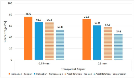 The principal stress of the PDL was greater in treatment of axial rotation than in treatment of lingual inclination for the two transparent aligners. In treatment of lingual inclination, the 0.75-mm transparent aligner led to 31% tension and 45% compression, and the 0.5-mm transparent aligner led to 26% tension and 31% compression, as compared to the fixed appliance. For treating axial rotation, the 0.75-mm transparent aligner caused approximately 46% tension and 28% compression, and the 0.5-mm transparent aligner caused 24% tension and 22% compression, as compared to the fixed appliance.