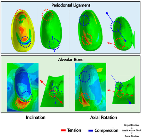 In correction of axial rotation, the tension and compression principal stresses were induced in the same areas of the PDL and alveolar bone by all orthodontic appliances. Most tension was observed in the lingual-mesial direction, and compression was observed in the buccal-mesial direction of the PDL and alveolar bone (Figure 17).